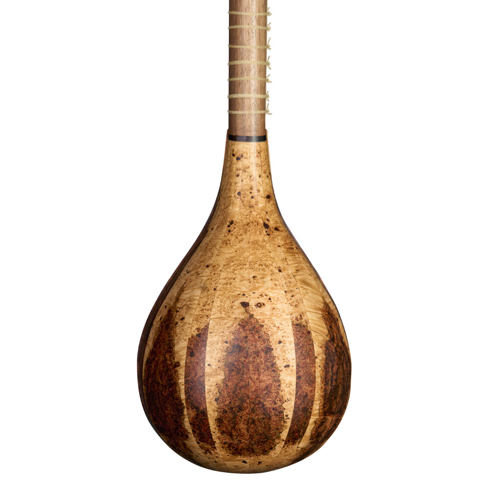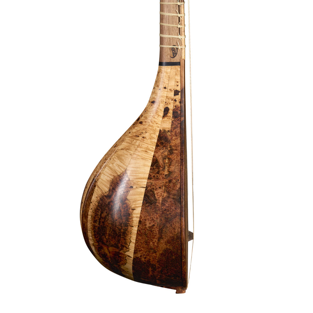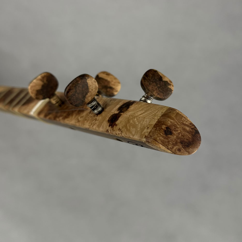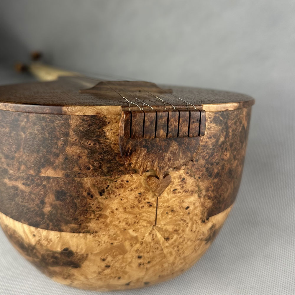 Instrument Name: Creation At the tip of the fingerboard, there is a natural heart shaped design symbolizing life giving and pulsating elements. The tuning pegs on both sides are newly designed with unique patterns. The tailpiece also features a heart motif. The wood of the neck is carved in a way that resembles a human body with a head and torso, inspired by the natural patterns of the wood. On the headstock, the natural heart shaped pattern of the wood is preserved, which can only be removed by removing a layer of the wood. This heart motif represents the vital and pulsating element of the instrument. Additionally, at the top of the instrument, a design of two human eyes has been naturally created within the wood, giving the instrument a special and human like appearance. The entire instrument is crafted with symmetrical patterns, completing its aesthetic balance and beauty. This unique and special design allows the Creation instrument to produce a warmer and richer sound. In 2025, the Creation instrument won the prestigious A’ Design Award competition.